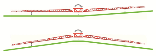 Два ультразвуковых датчика на штанге могут контролировать высоту опрыскивания с помощью функции центральной коррекции наклона и подъема штанги. Эта экономически эффективная система подходит для выполнения работ на пологих склонах и на неровных полях.