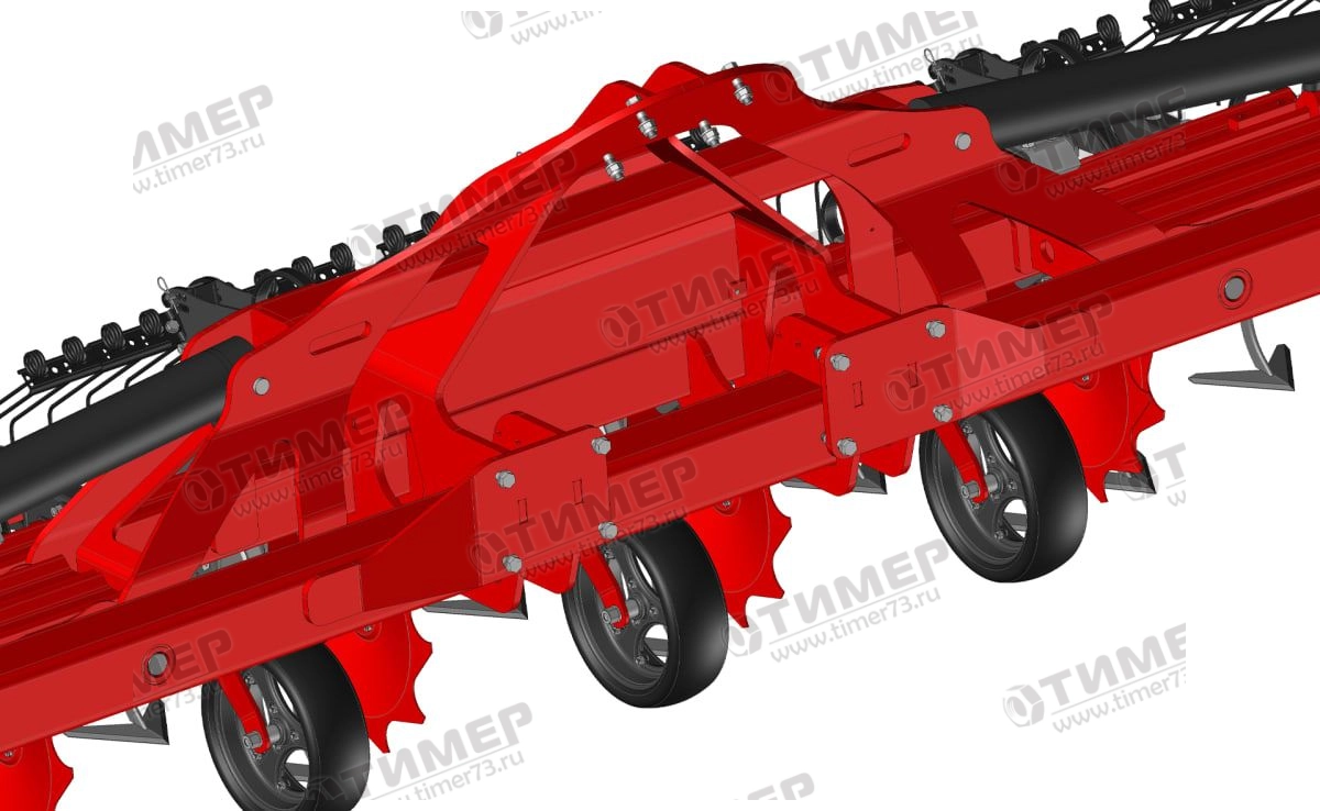 Два или четыре дополнительных опорных колеса, расположенных перед средней балкой рамы или/и на внешних расширителях, обеспечивают оптимальное копирование контура почвы, большую устойчивость и постоянный контроль глубины, особенно при большой ширине захвата. Настройка глубины осуществляется механически с помощью винтовой регулировки с фиксацией на всех колесах. Шкала указывает глубину для точной регулировки.